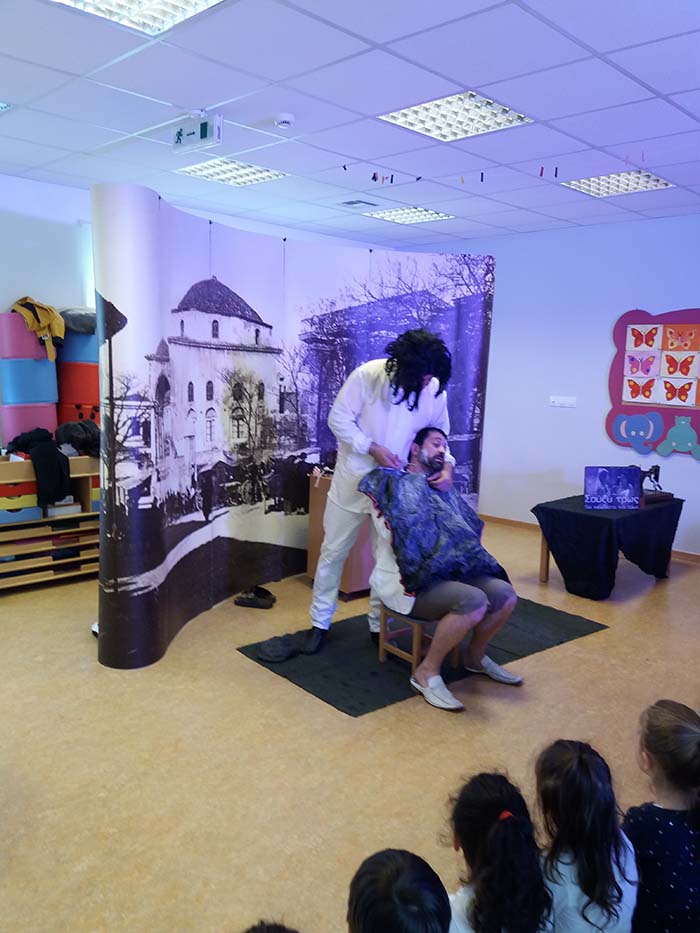 Οι μικροί μας φίλοι είχαν την ευκαιρία να γνωρίσουν με βιωματικό τρόπο επαγγέλματα που τείνουν να εξαλειφθούν άλλα αποτελούν σημαντικό κομμάτι της παράδοσής μας, όπως αυτά του λούστρου, του μπαρμπέρη, του νερουλά, του γαλατά, του καφετζή, της μοδίστρας, κα.! Με μεγάλη τους χαρά τα νήπιά μας ανταποκρίθηκαν στο κάλεσμα των ηθοποιών να αναλάβουν και αυτά το δικό τους ρόλο στην αναβίωση των επαγγελμάτων!!!